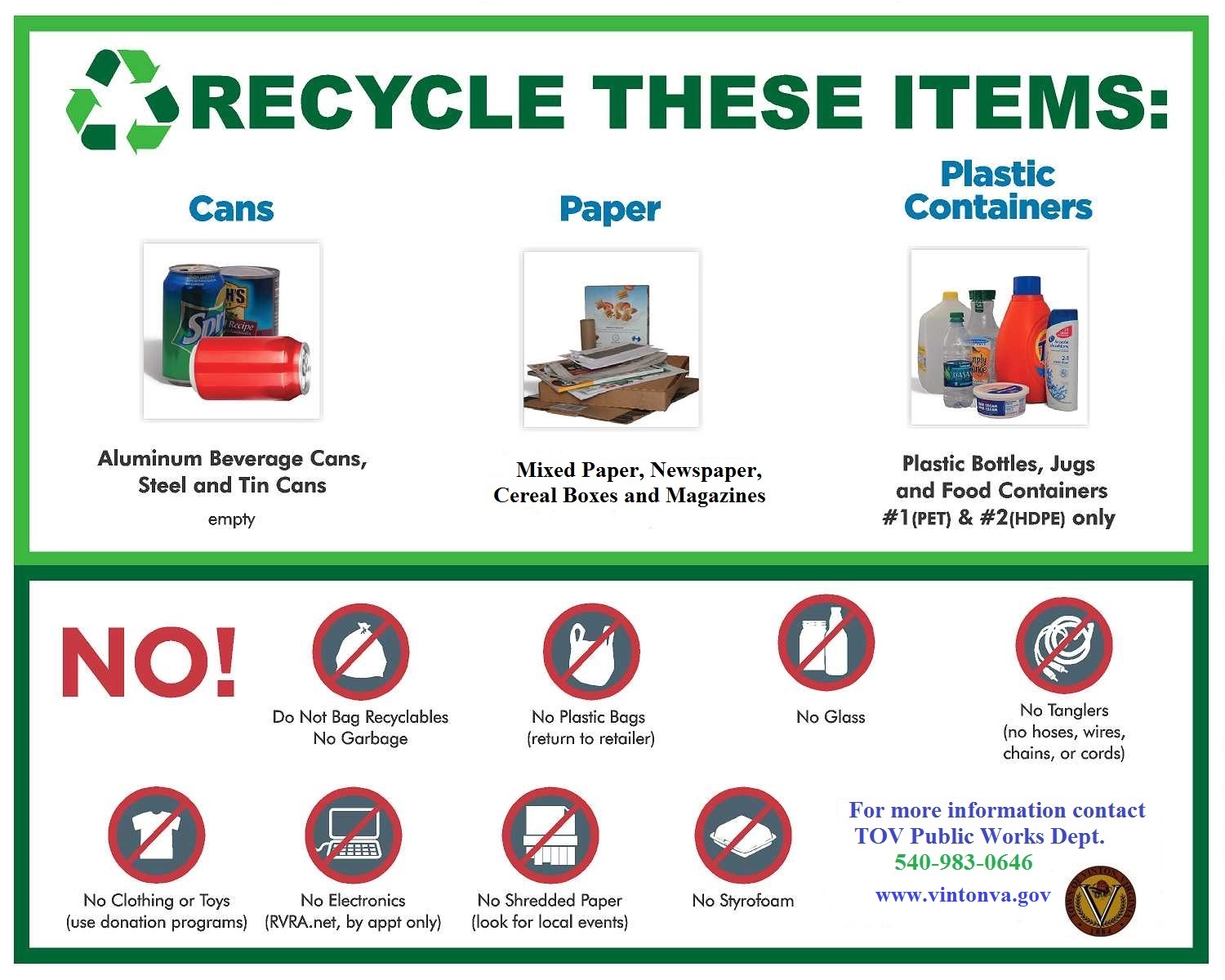 - No plastic bags of any type (trash bags or grocery/shopping bags). Some grocery stores have collection bins for used plastic bags.